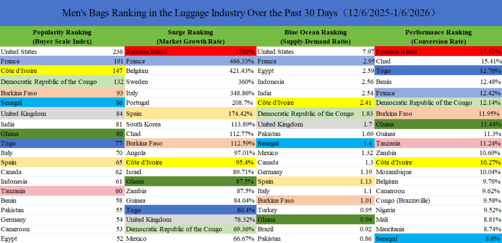 Data Source: Alibaba.com Men’s Bags Ranking (December 6, 2025 – January 6, 2026)