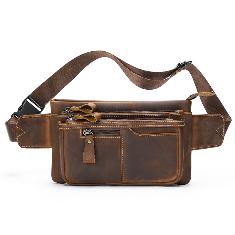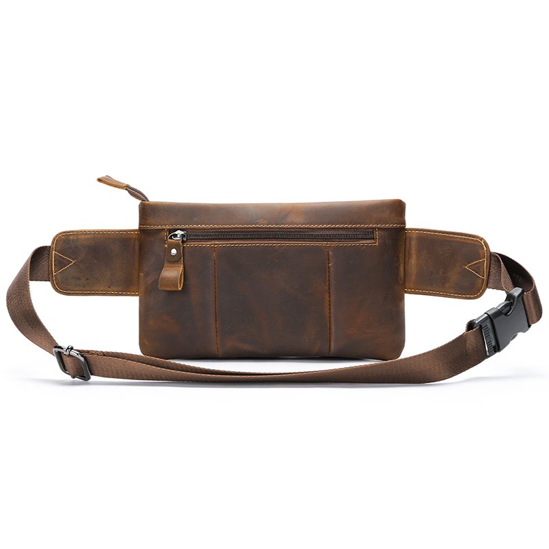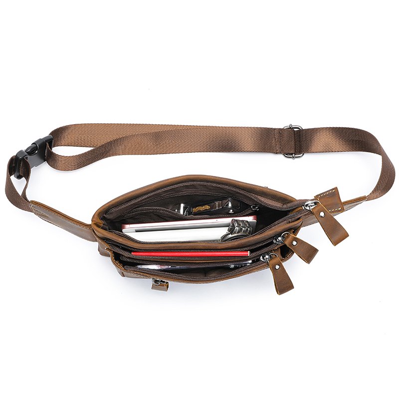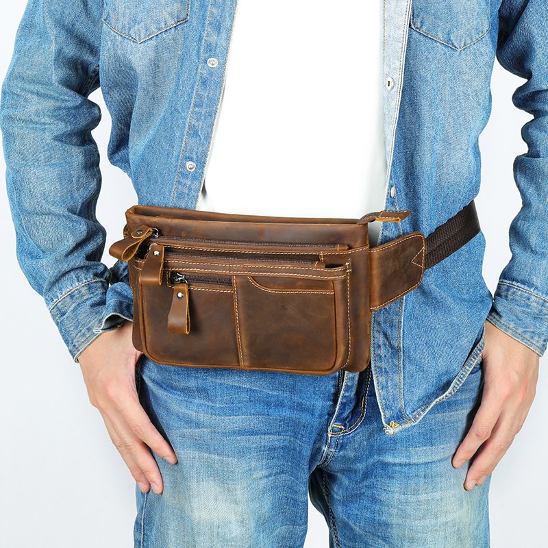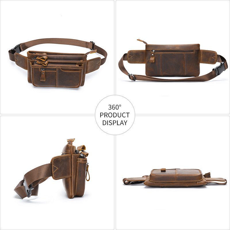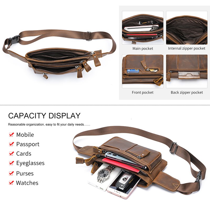 This is a small genuine leather waist bag made of high-quality cowhide, with a retro and casual style. It is very suitable for sports or daily use. But please note that it can hold a mobile phone, but not an iPad.leather waist pack