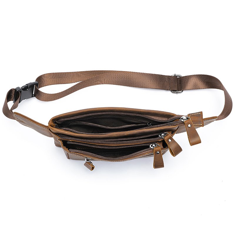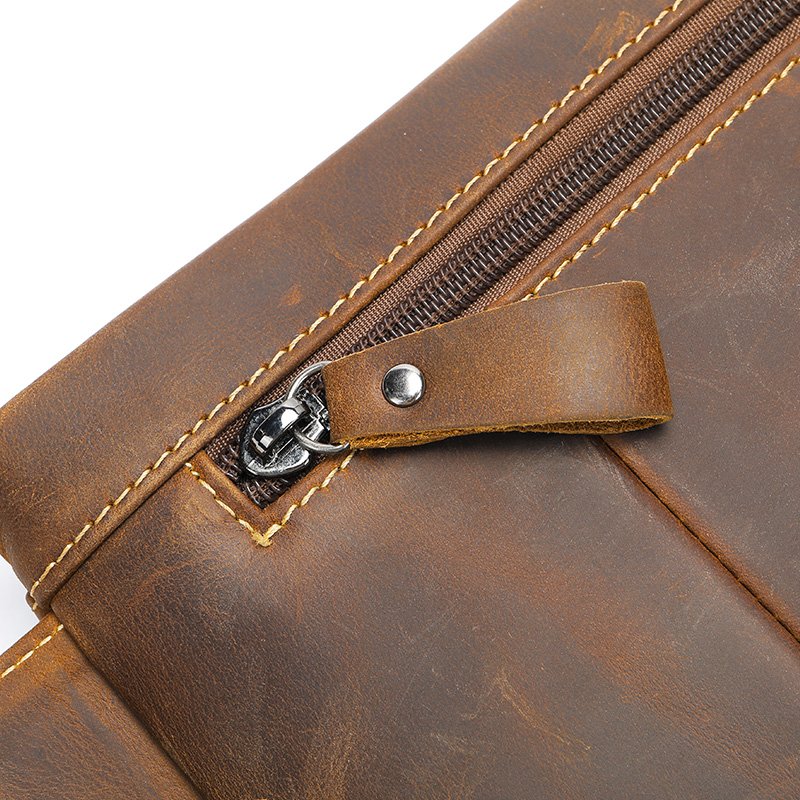 All zippers of this fanny pack are made of high-quality hardware, paired with leather zipper pulls. When opening or closing the zippers, they operate smoothly without jamming. This type of zipper is used in many of our leather bags, and customer feedback has been excellent, with users noting the comfortable zipper experience.