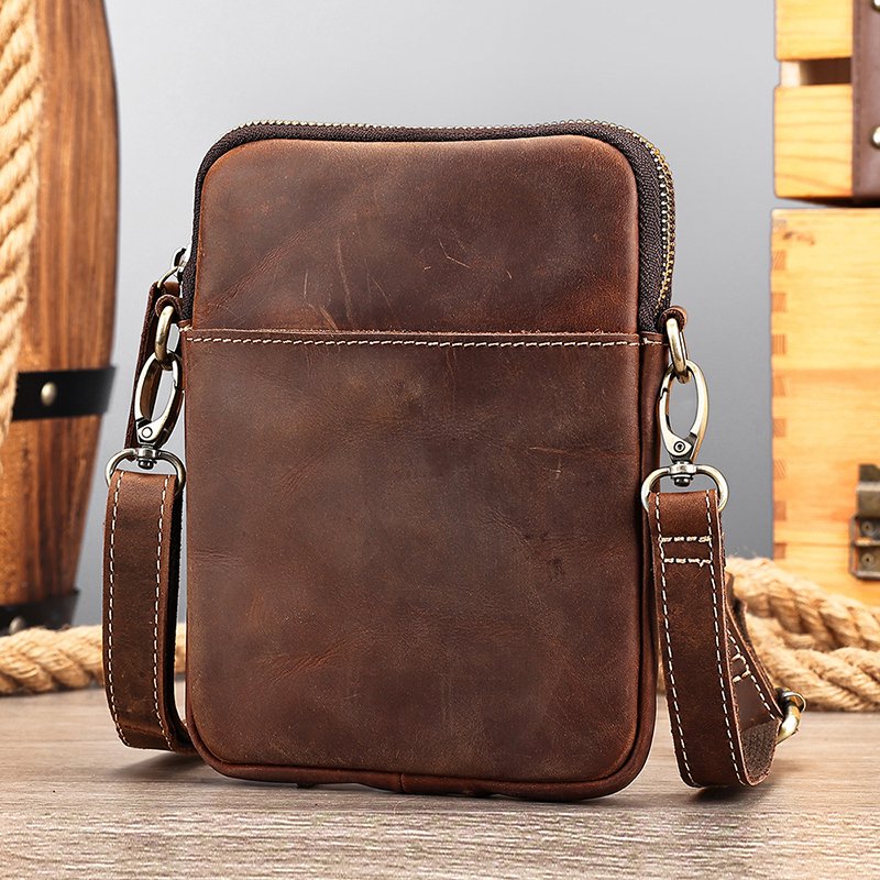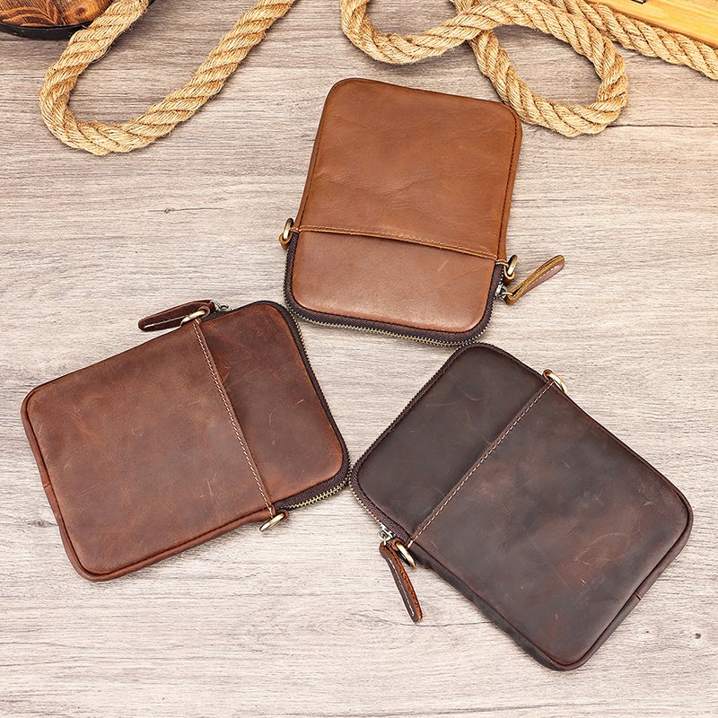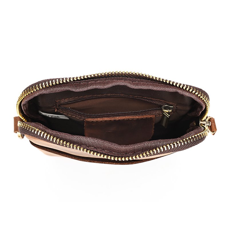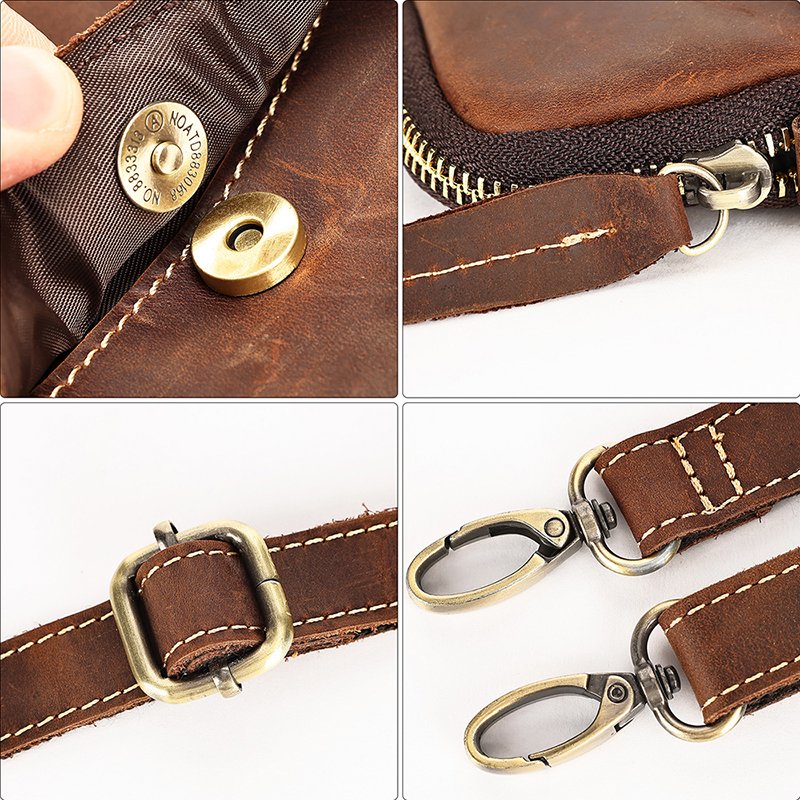It features high-quality detachable hardware buckles—thick, sturdy, and durable. The vintage gold finish of the buckles complements the leather bag perfectly, creating a harmonious look. Additionally, the bag’s stitching is designed in a contrasting color to the main body, adding a unique touch that makes this leather phone pouch even more distinctive!
